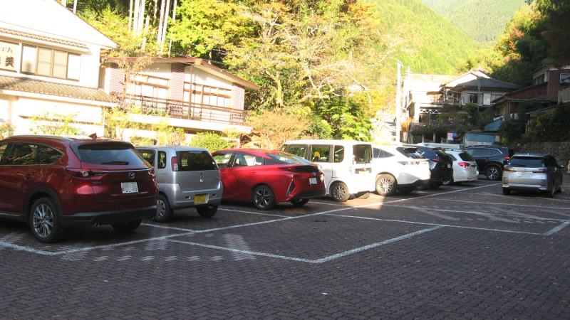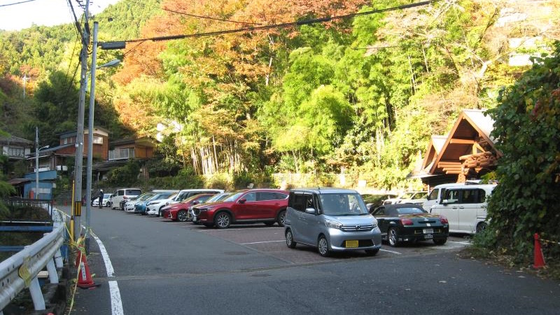 ここが今回の起点となる町営鳩ノ巣駐車場です。無料で24時間開放されているため、平日の朝でもこんな感じでかなり混んでいます。
