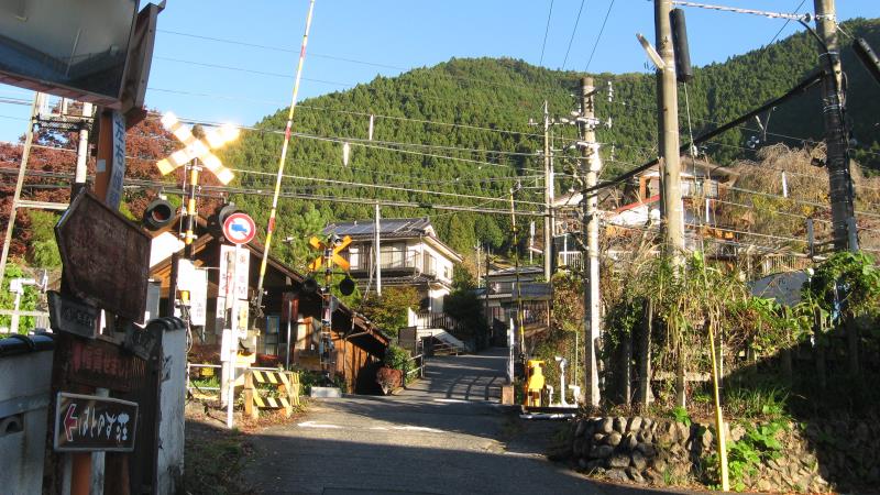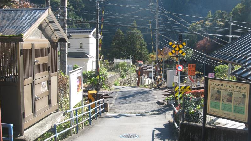 右へ曲がるとすぐに鳩ノ巣駅ですが、登山口へは踏切を渡り直進します。