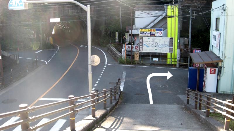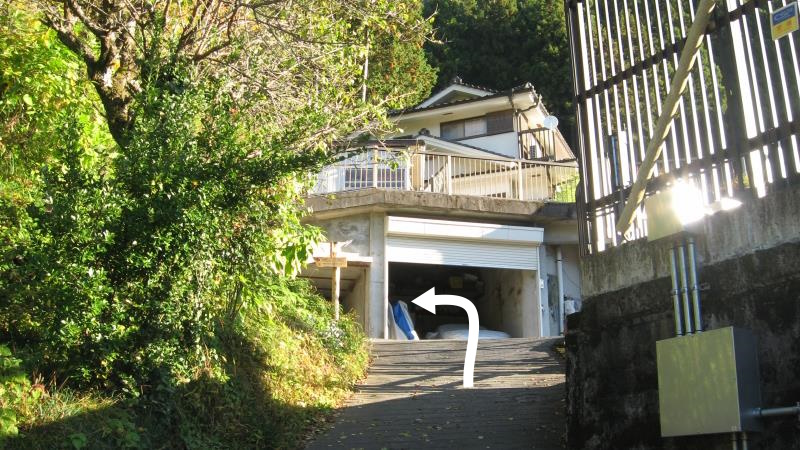 駐車場から10分ほど坂道を登ると正面に民家が見えてきて行き止まりになります。そこの左側が登山口です。