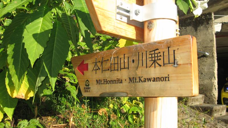 登山口には「本仁田山・川乗山」と書かれた案内板が立っています。