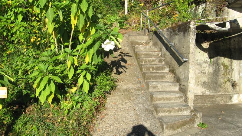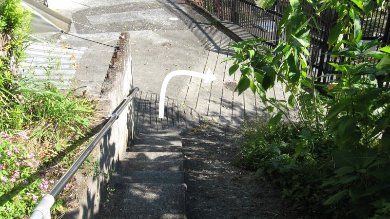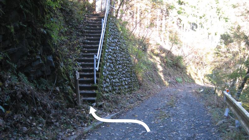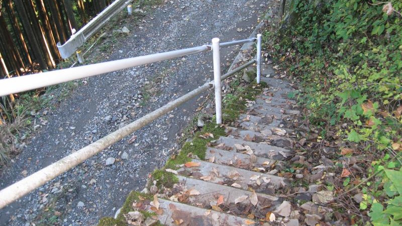 70mほど下ると左側に階段が見えてきます。ここから森の中に入ります。