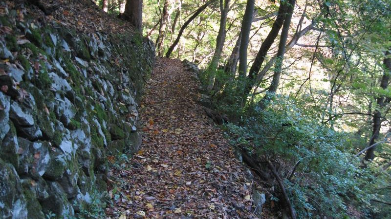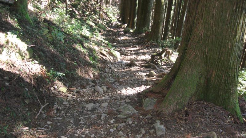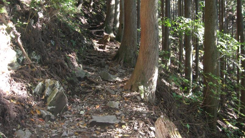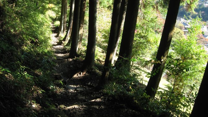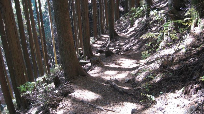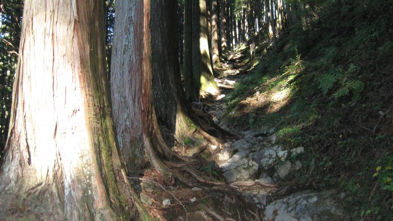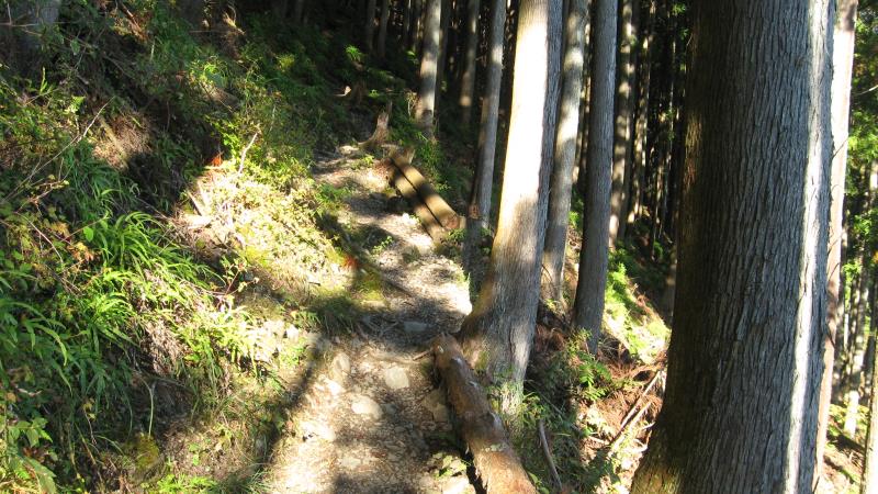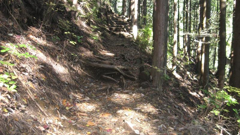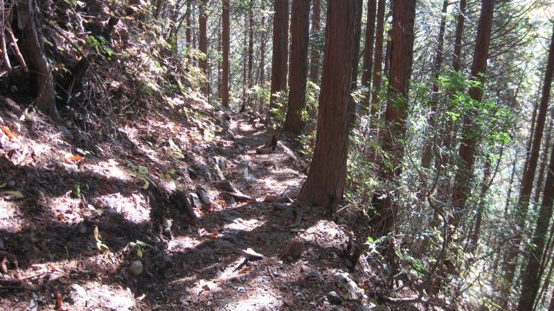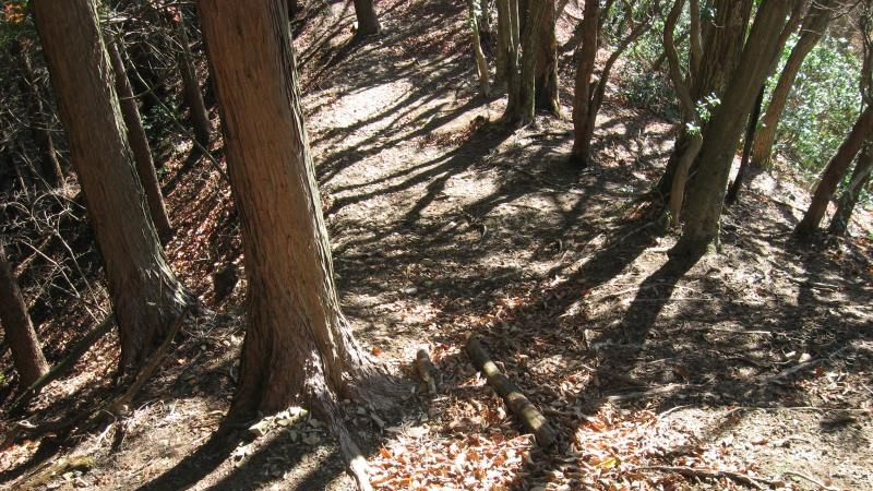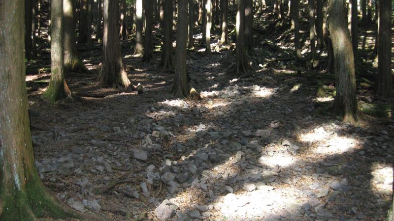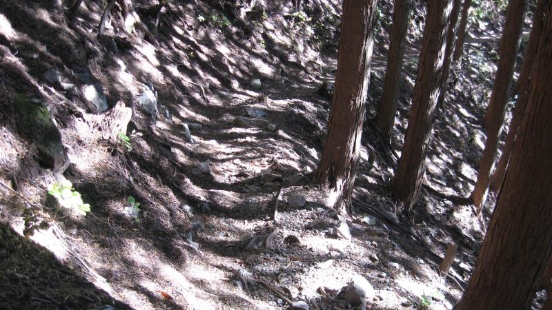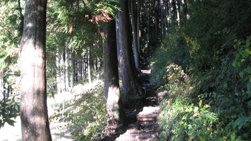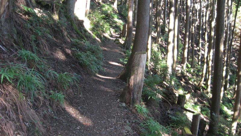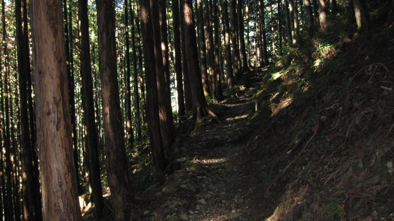 東側の斜面に作られた登山道は昼間でもちょっと薄暗くなります。