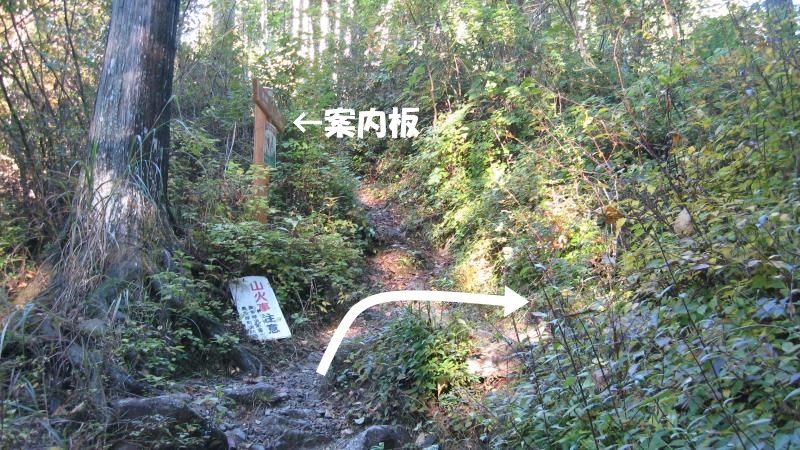 登山口の20mほど手前の右側にある看板ですが、振り返らないと気づきません。