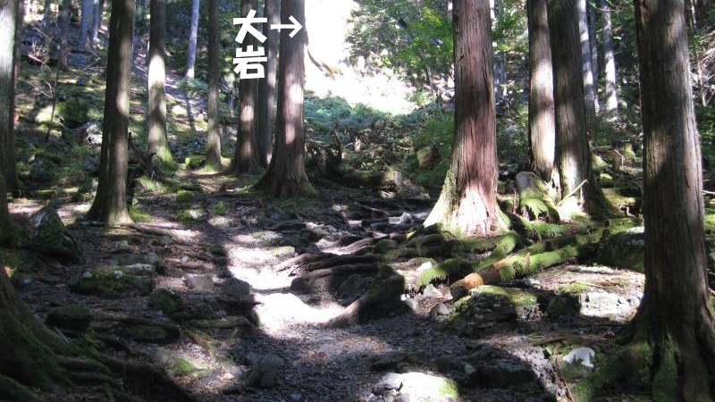 大根ノ山ノ神から40分ほど歩くと正面に大きな岩がある分岐が見えてきます。