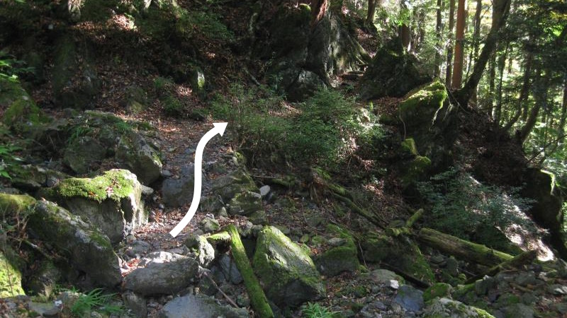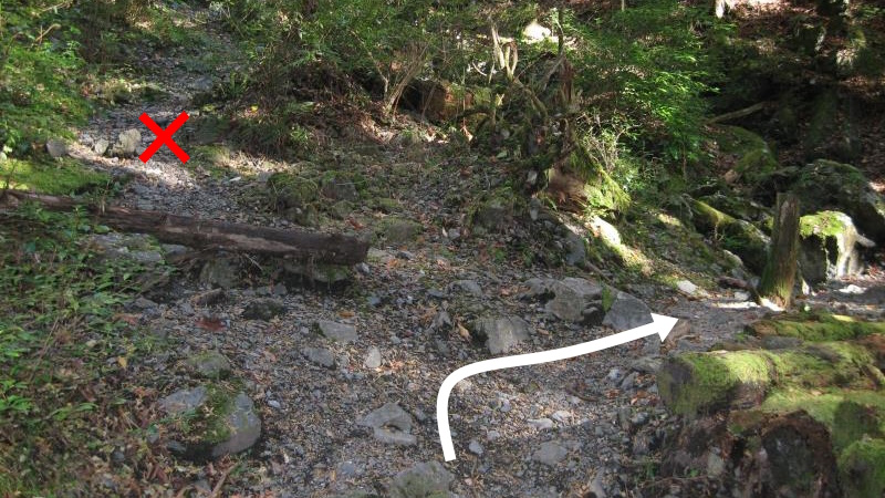 大きな岩のほうに進む道もありますが、ここは右へ曲がり、枯れた沢(雨が降ったら小さな沢になりそうな沢)を渡り右へ進みます。