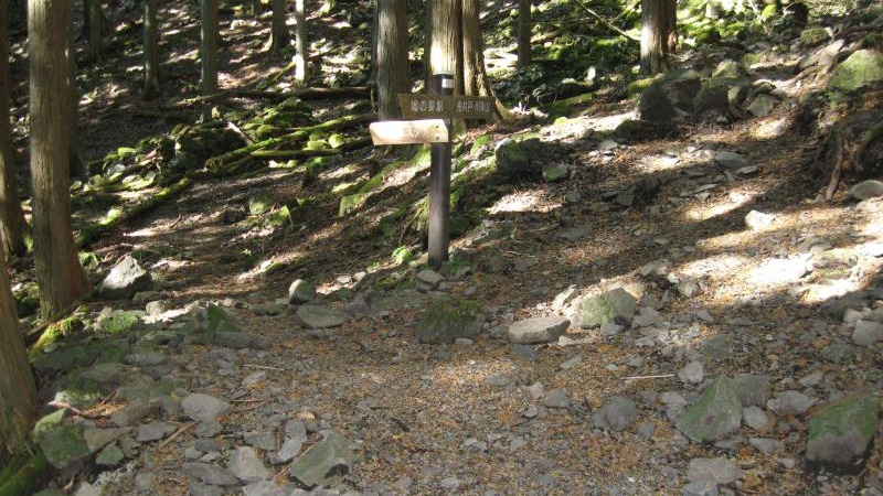 駐車場から45分ほど歩くと正面に案内板のある分岐があります。直進するとすぐに未舗装の林道に出ます。