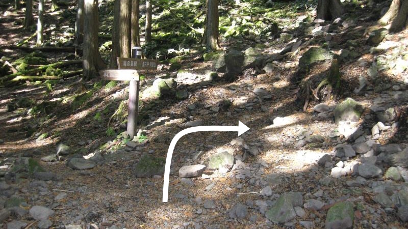 3分ほど登山道を登るとすぐに分岐が見えてきます。ここを右に曲がります。