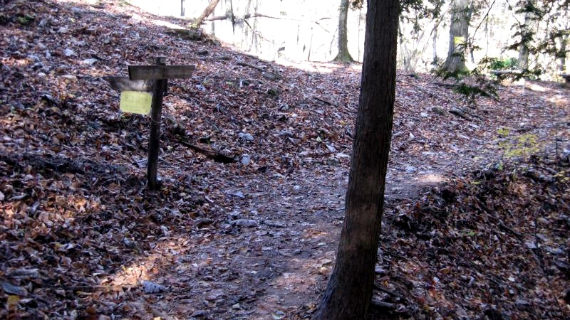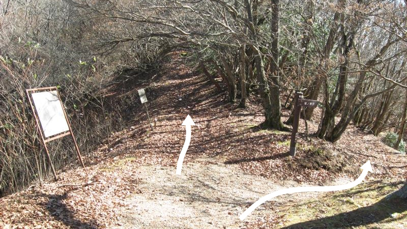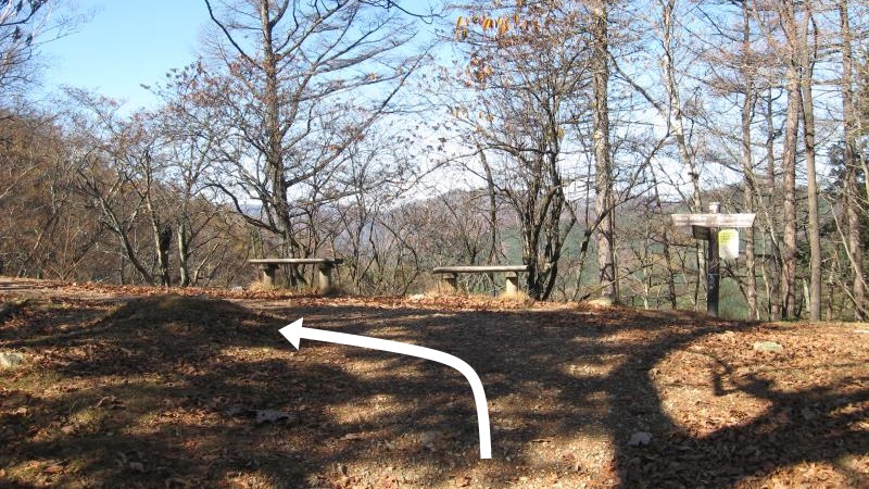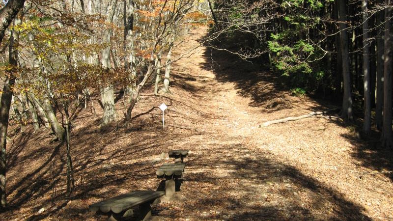 尾根道との合流地点には案内板とベンチがあります。ここを左へ進みます。