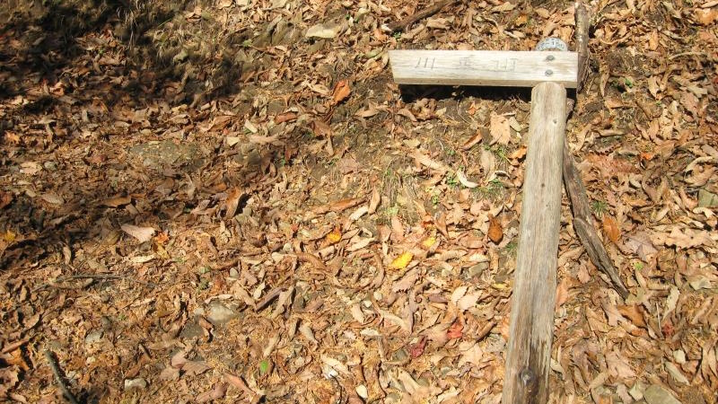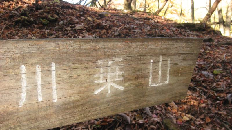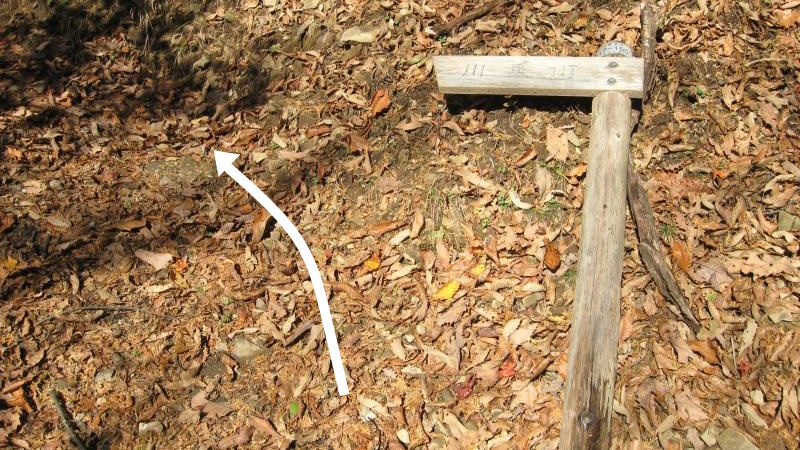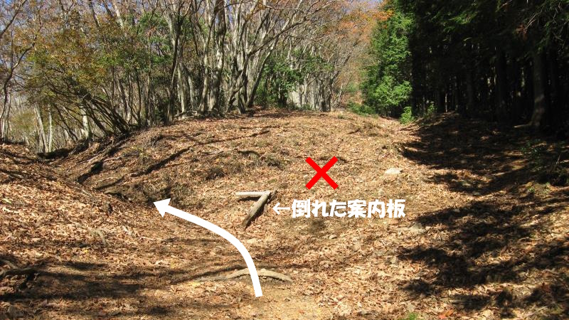 上り斜面の途中に倒れた案内板があります。見ると「川乗山」と書かれています。ここは直進せずに左へ進みます。