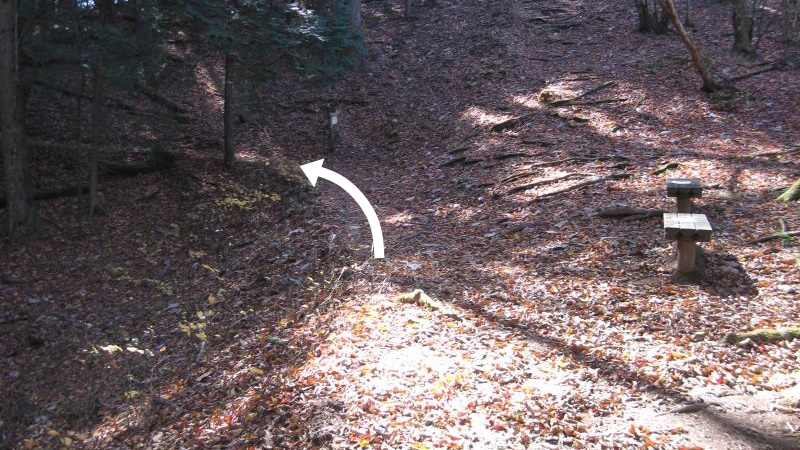 ベンチから12~13分の場所で直進すると登山道が下りになる場所があります。ここは直進してはダメな場所で、大きく右に曲がります。