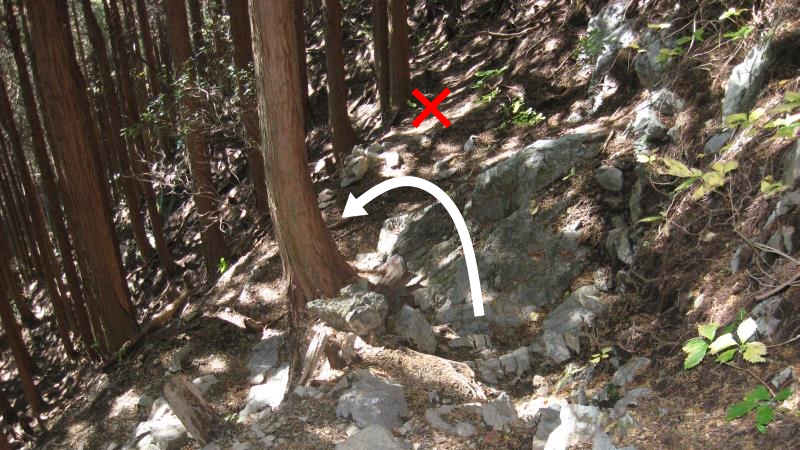 これが間違っている直進ルート。どうみても正規の登山道のように見えます。しかし、数分歩くとどんどん道は細くなり、何かおかしいと感じ始めます。