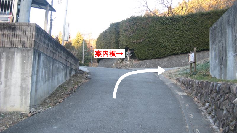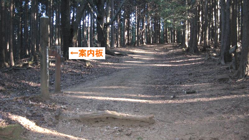 坂を登りきると案内板の立つ分岐があります。ここを右へ進みます。