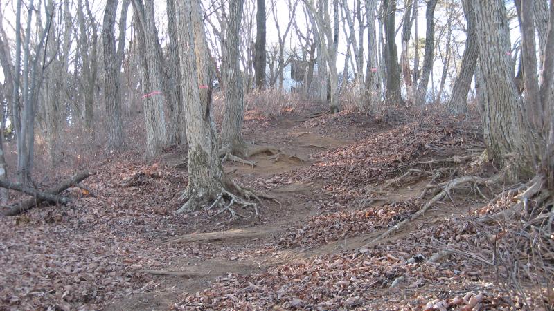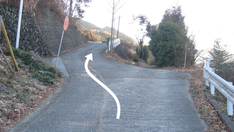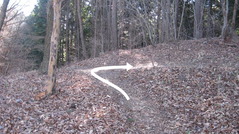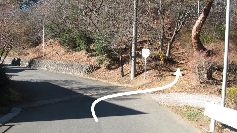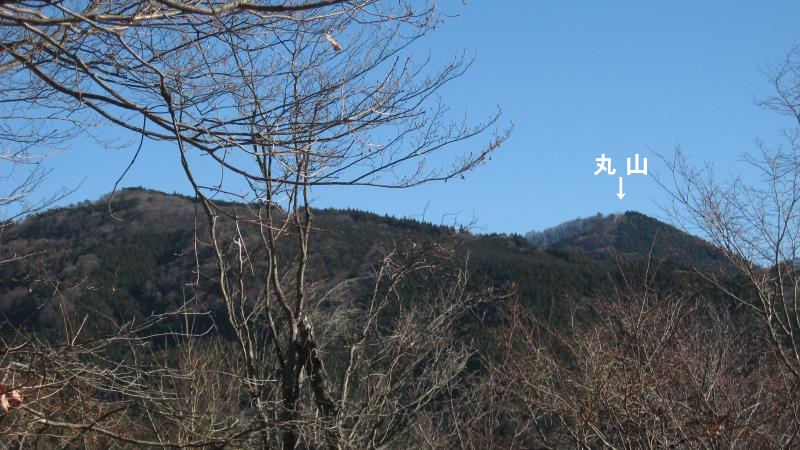 丸山山頂はここを右に曲がり、いったん坂道を下ります。