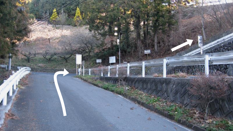 登山口へは、第一駐車場から299号線を渡り右へ進むとすぐに果樹公園、農村公園への案内板が見えるので、そこを左へ曲がります。
