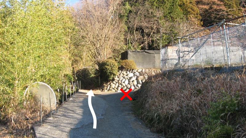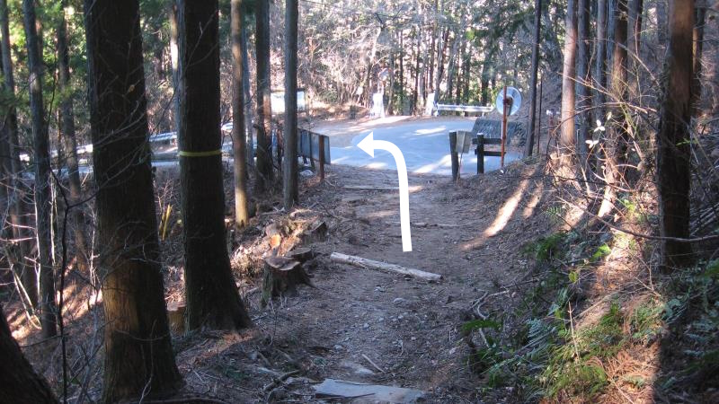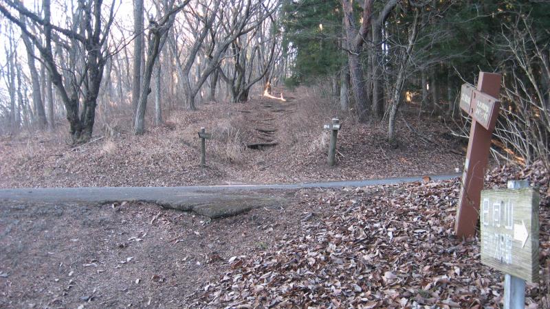 公衆トイレから2分ほど舗装道路上を歩くと直進の道が未舗装の登山道になります。ここは直進し、登山道に入ります。