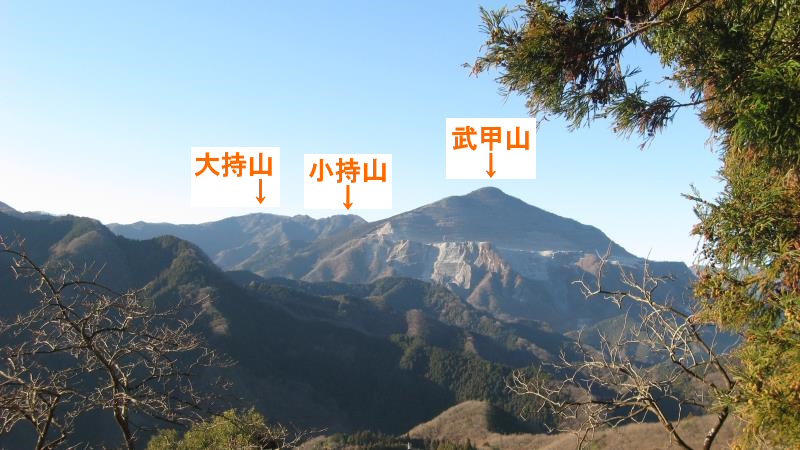 登山道を歩き始めるとすぐに右側の見晴らしがよくなる場所があります。そこからは武甲山、大持山そして小持山が良く見えます。