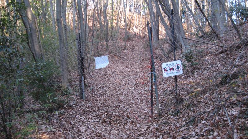 日向山山頂から14分ほどで鹿よけネットが見えてくるのでロープを外して通過します。