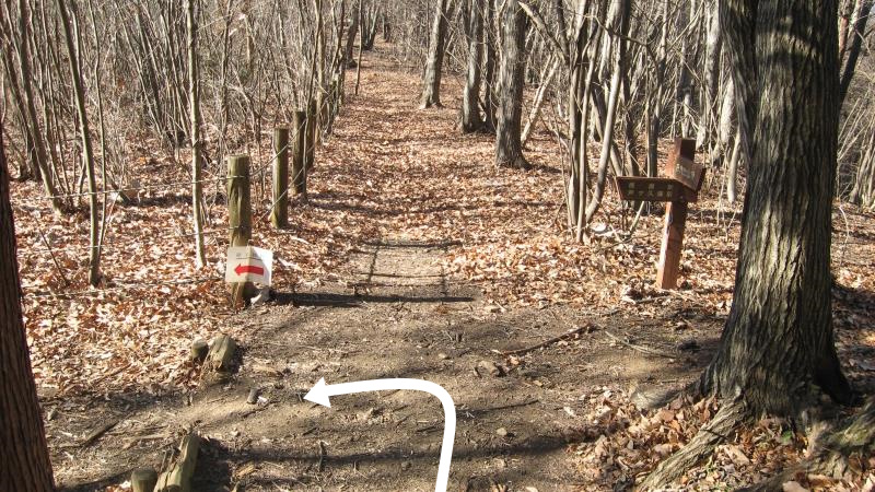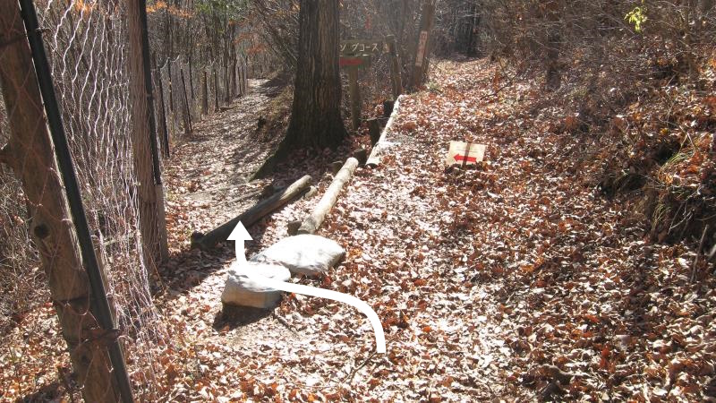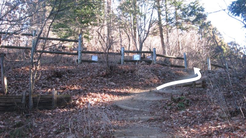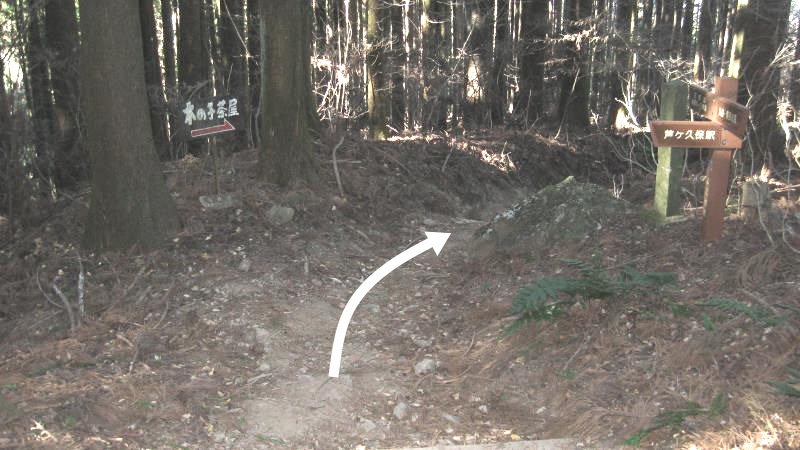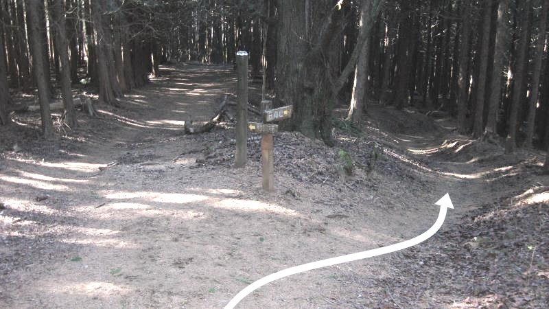 山頂から5~6分歩くと右に案内板が見えてきます。ここを左へ曲がります。