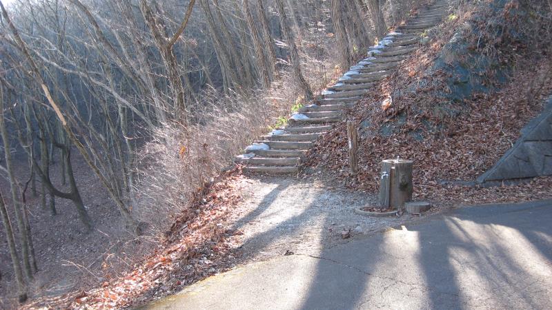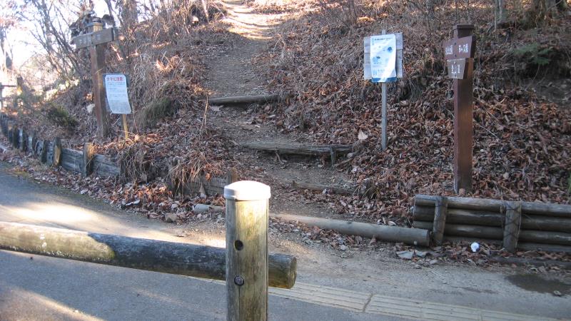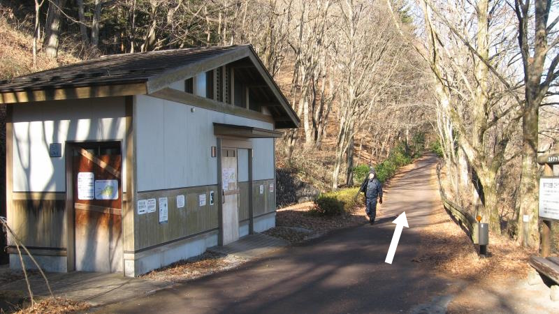 本来のルートとしてはトイレの手前の階段を上り登山道を進むのですが、今回は仮設トイレに立ち寄ってみたかったので閉鎖されている公衆トイレの前の舗装道路を歩いてみることにしました。