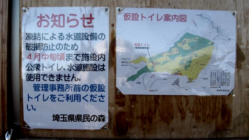 仮設トイレはここから舗装道路上を5~6分進んだ県民の森管理棟の近くにあるとの案内が貼られています。(下山時にここから仮設トイレを経由してみることにしました)