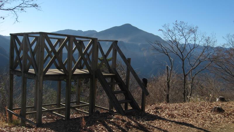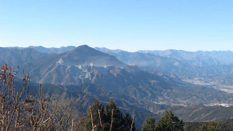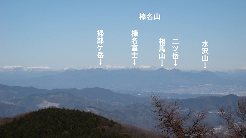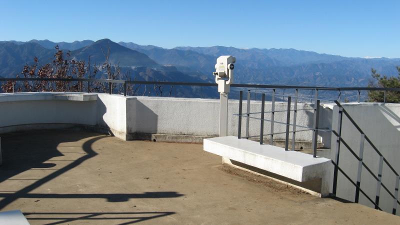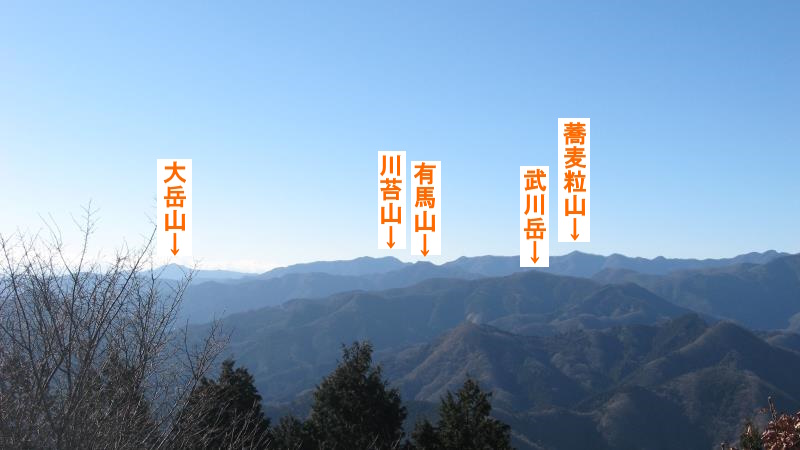 展望台から見える一番左端の山は東京の大岳山です。そこから右に川苔山、有馬山、武川岳、蕎麦粒山などが見えます。