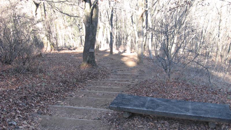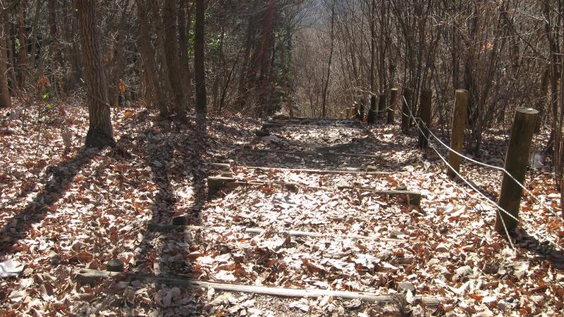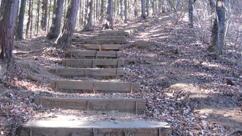 道なりに登山道を進み、角材で組まれた階段を上ります。