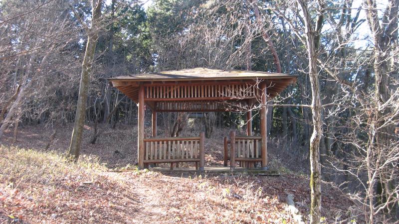 屋根付きの休憩舎の先を右に曲がります。ここで朝、登ってきた道に戻ります。