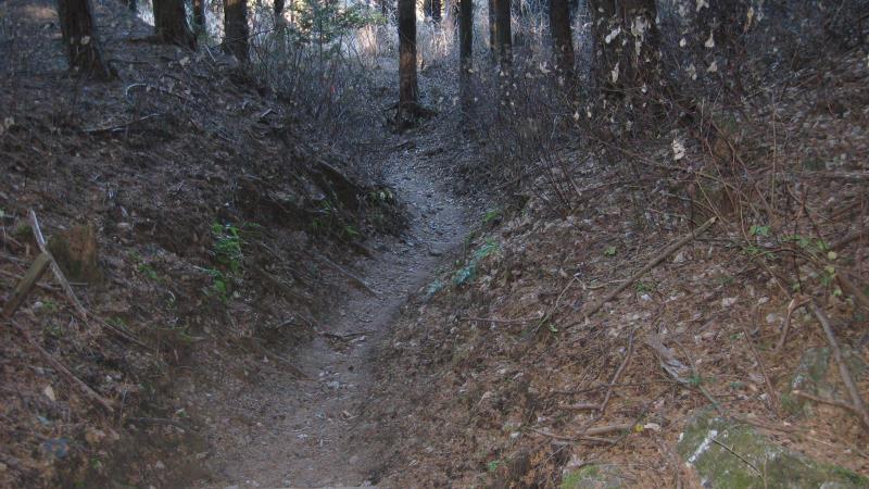 右へ進むとさらに薄暗い森の中の細い登山道を歩くことになります。