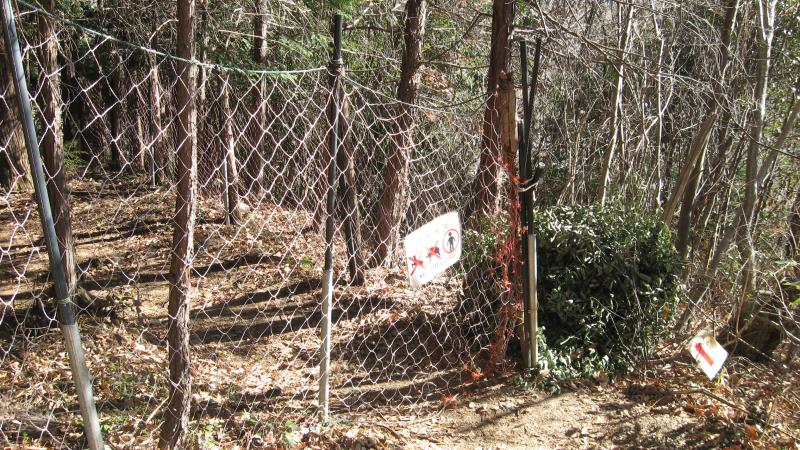 県民の森管理棟への分岐から7分ほど歩くとフェンスがあり、大きく左に曲がります。