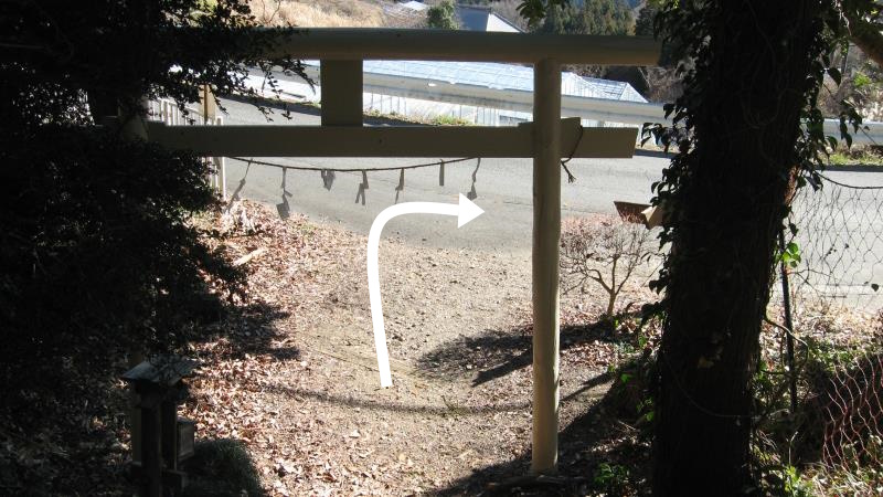 すぐに鳥居が見えてきて舗装道路に出ます。ここを右へ曲がります。