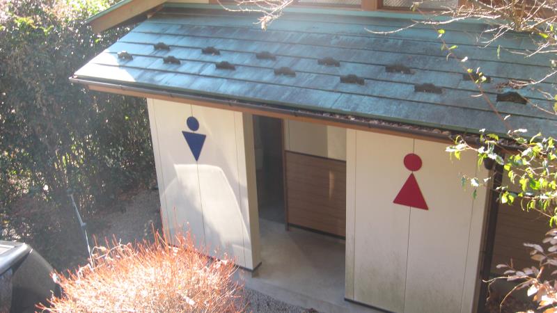 日向山から駐車場へ向けて下山し、琴平神社の鳥居をくぐり舗装道路に出て右へ曲がったところにある男女別の公衆トイレです。