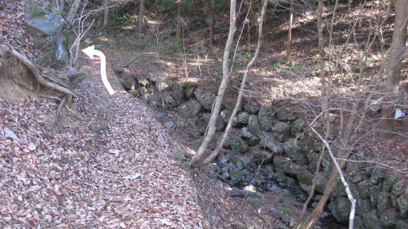登山道を道なりに進むと小川が流れている場所に出ます。その先の小さな木橋を渡り左へ進みます。