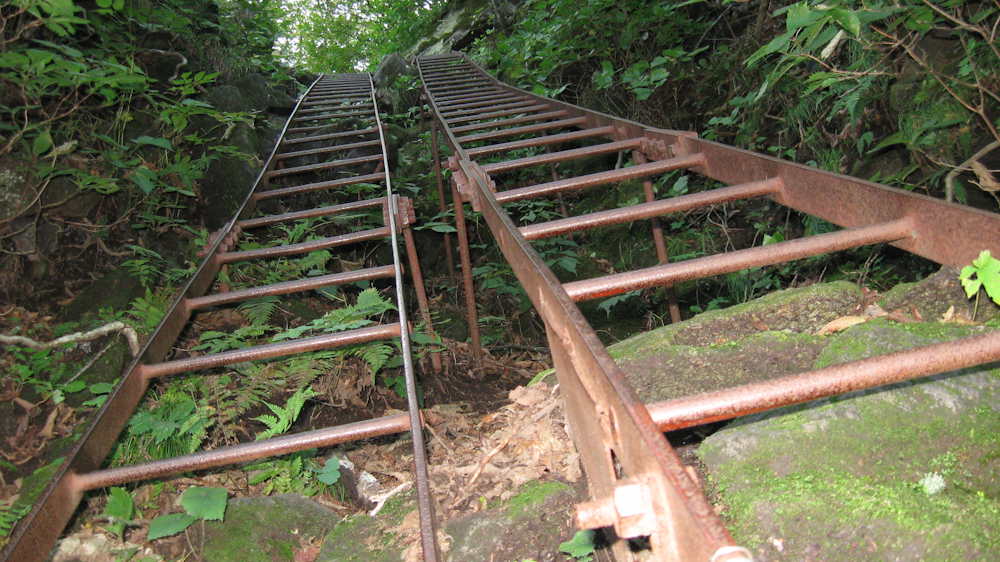 はしごの次は、傾斜の緩い場所にははしごを寝かせて階段っぽくしたものが出てきます。手すりがあるので何とかあるけますが、踏板はなく鉄の棒なので、とても歩きづらい構造になっています。