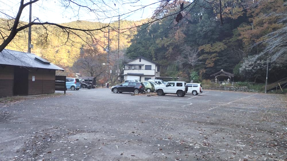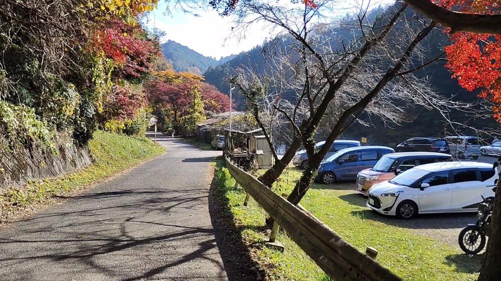 ゆずとさつまいもが売っていた分岐から10分ほど舗装道路上を歩くと正面に駐車場が見えてきます。ここが鎌北湖第二駐車場です。鎌北湖へはここを左へ進みます。