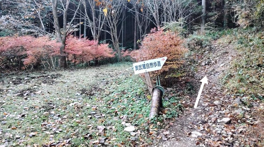 すぐに「奥武蔵自然歩道」と書かれた案内板が見えてきます。ここから本格的な登山のスタートです。すぐに森の中に入ります。
