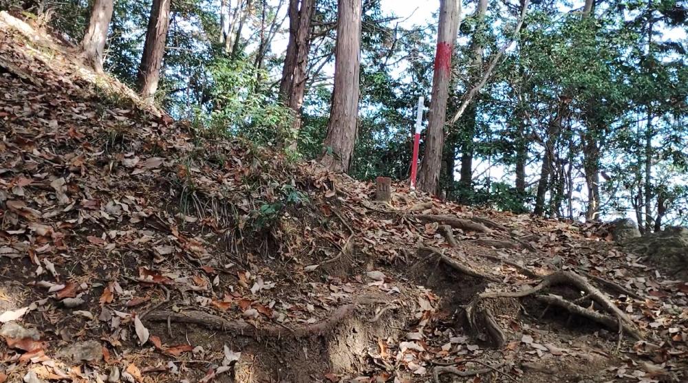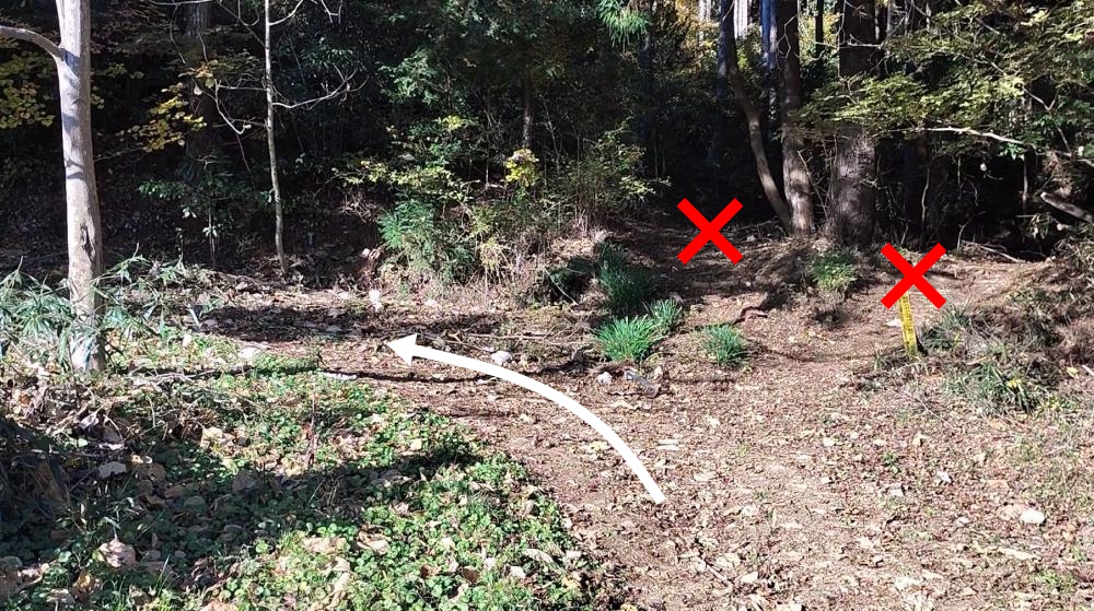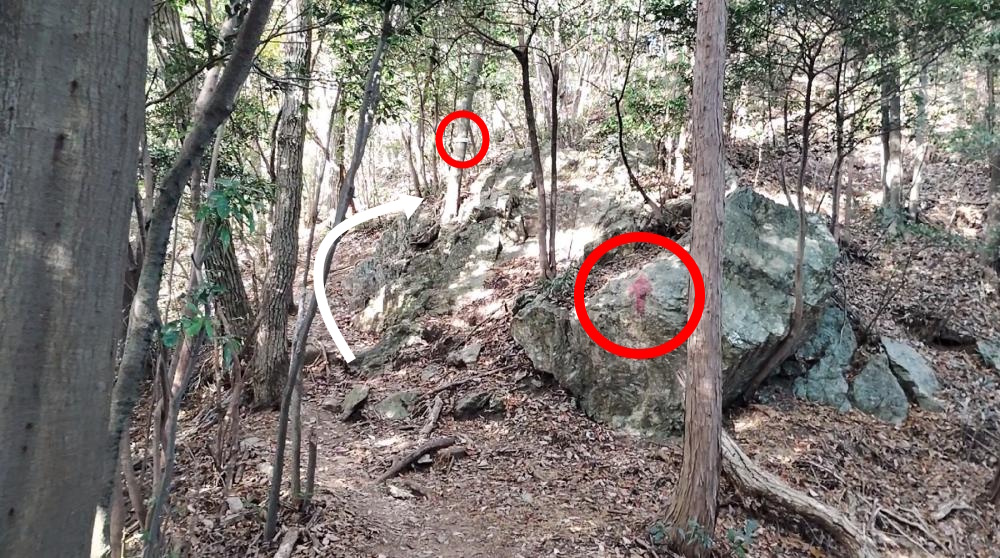 右の斜面を登ると木の幹に赤いペンキが塗られているのがわかります。そちらへ進みます。