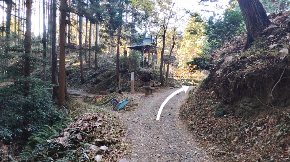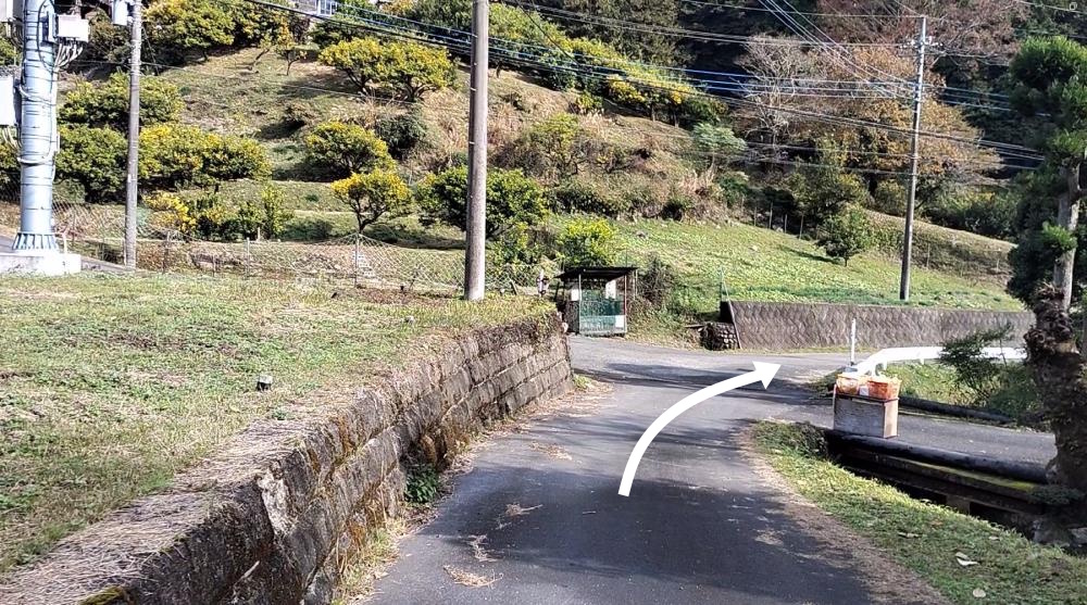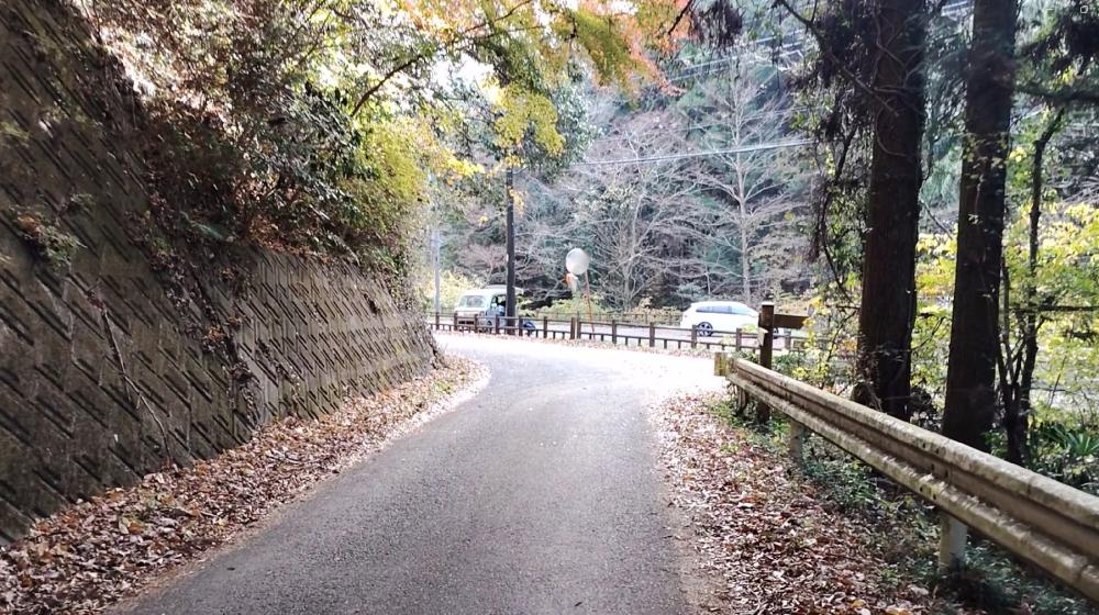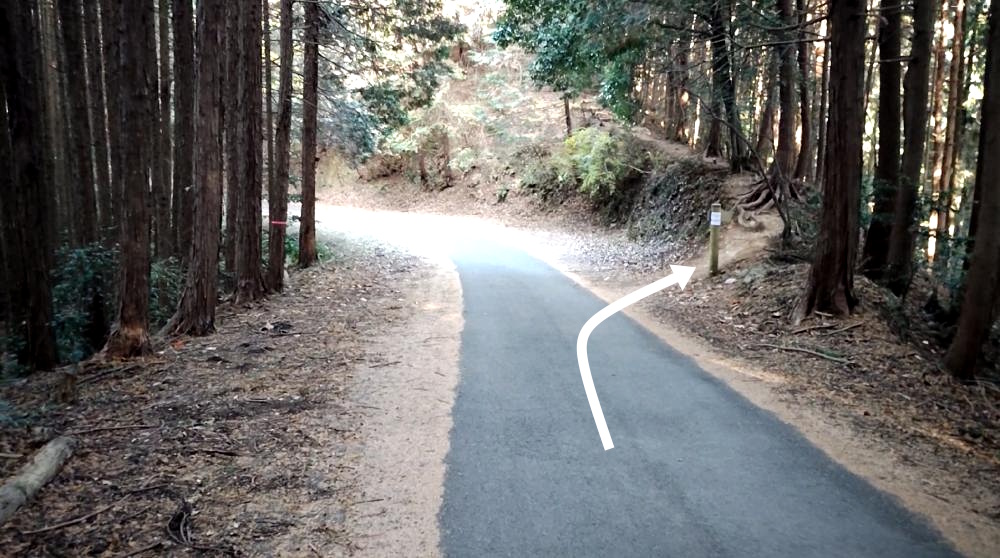 奥武蔵自然歩道の入口より20分ほど歩くと登山道から舗装道路に出ます。舗装道路に出たらそのまま右へ進みます。