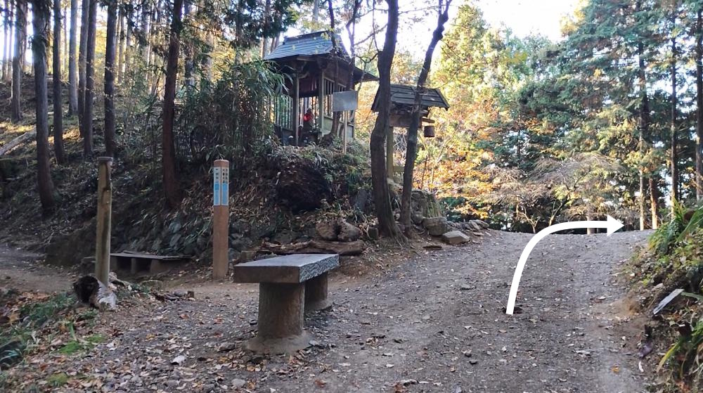 見晴らしのよい場所から13分ほど緩やかな上りの登山道を進むと北向地蔵に到着します。ここを左へ進むと物見山で、舗装道路を渡った向かいの登山道を進むとユガテへ行くことができます。