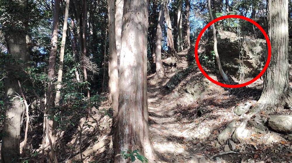 登山口から道なりにちょっと険しい登山道を5分ほど登ると右側に大きな岩が見えてきます。ここが観音ケ岳への分岐なのですが、案内板は一切ありません。