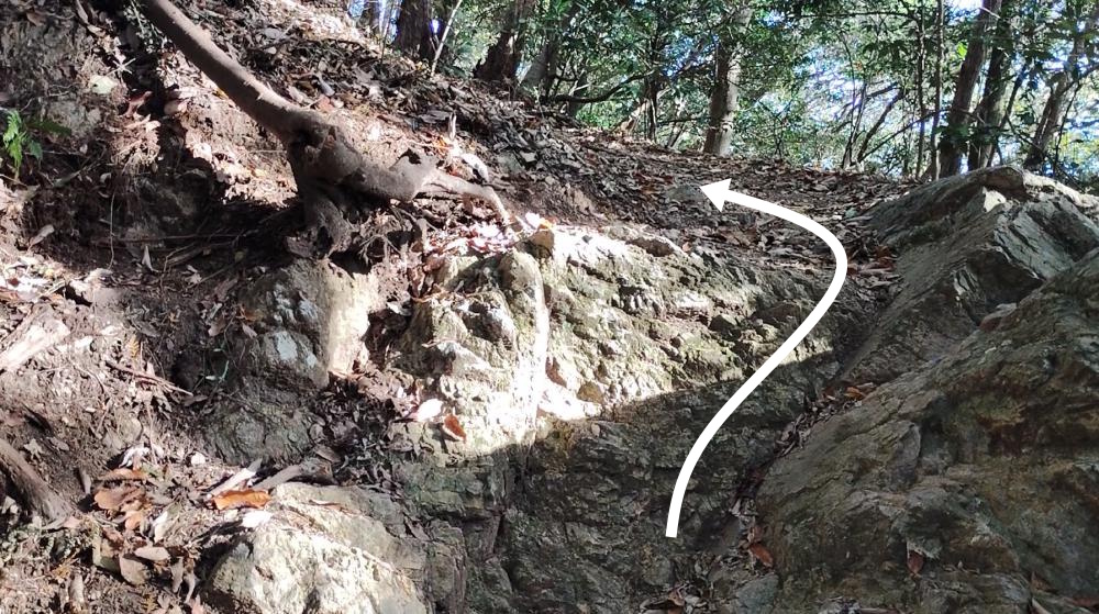 大きな岩のすぐ先の急斜面をよじ登り踏み跡に従って左へ進みます。