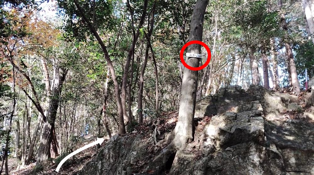 そしてその奥の木の幹には、ちいさな板がくくりつけられているのがわかります。ここがスカリ山への分岐です。