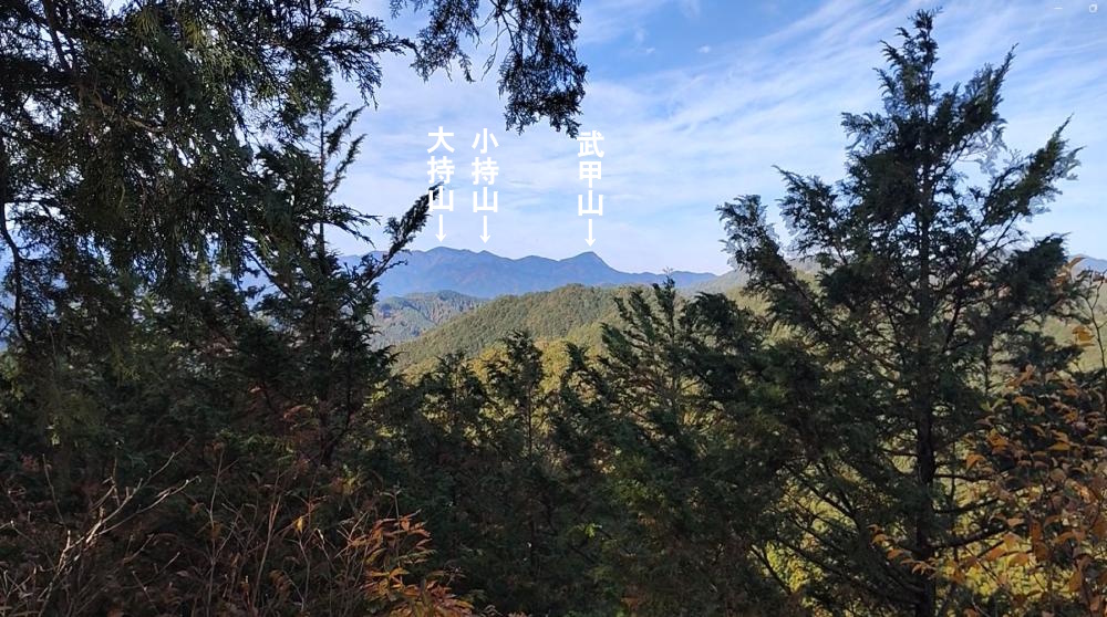 さらに左側の木の間からは、秩父の武甲山と小持山と大持山が見えます。