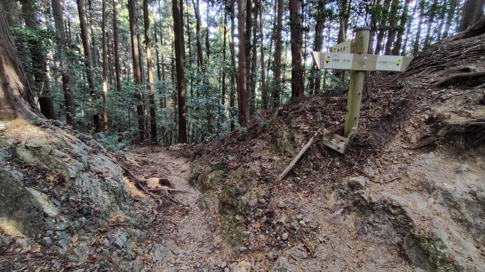 スカリ山山頂から14分ほどで鎌北湖方面へ下る分岐に到着します。ここで案内板通り、鎌北湖方面へ進みます。