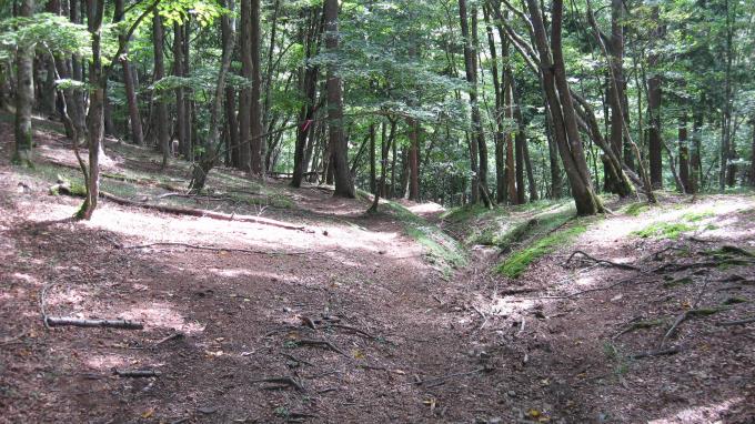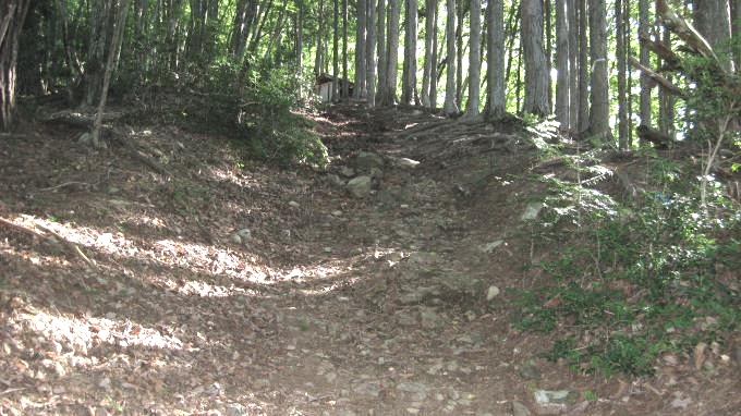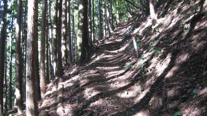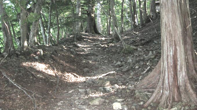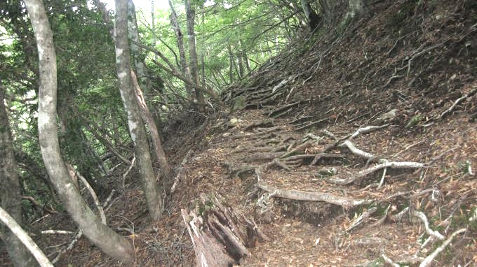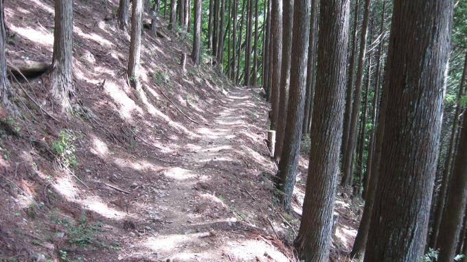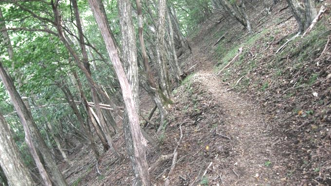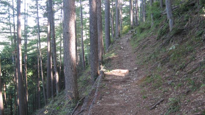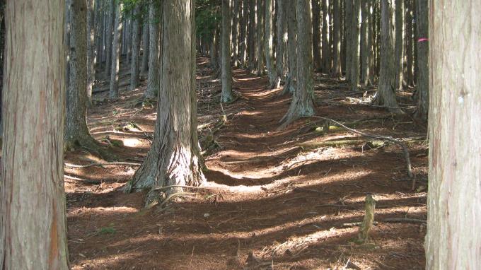 桧(ひのき)の植林帯の中の登山道は晴れていてもちょっと薄暗く、鳥や虫の声もなく静かです。