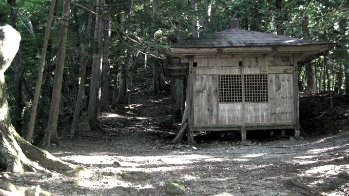 しいたけ園から10分ちょっと下ると神社が見えてきます。駐車場まではもうすぐです。
