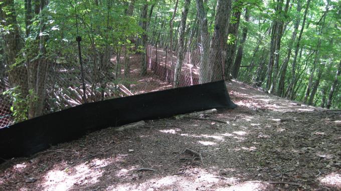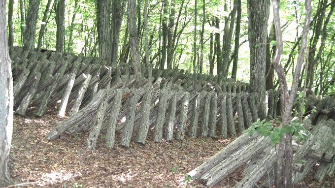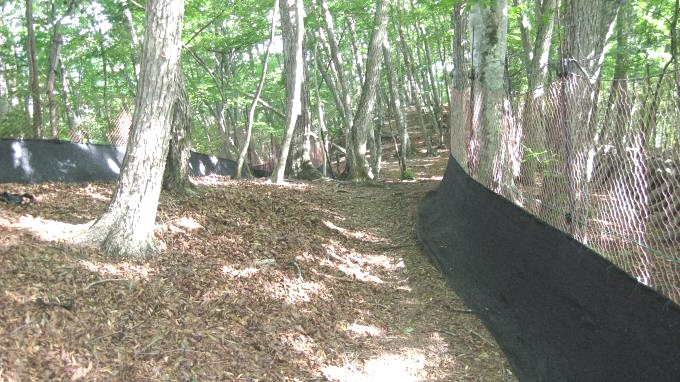 ネットフェンスの向こう側には、しいたけ栽培用の榾木(ほだぎ)が並べられています。