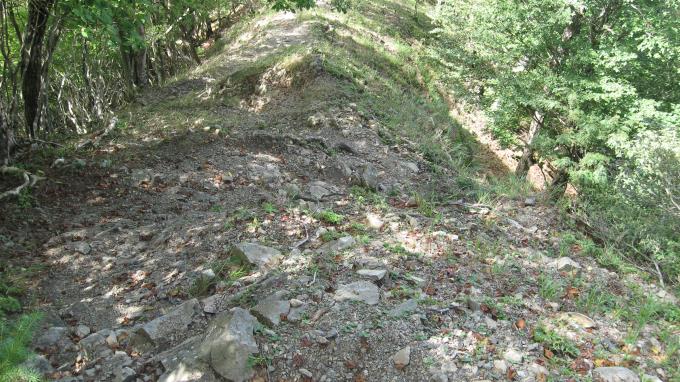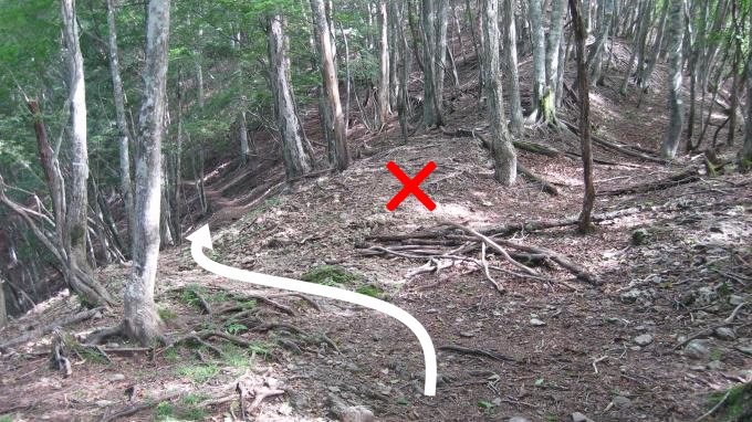 直進してしまう人が多いようで、手前に木の枝がたくさん積まれているのがわかります。手前で全体を見渡せば左に登山道があるのがわかるのですが、疲れて足もとばかりを見ていると見落としてしまうのです。