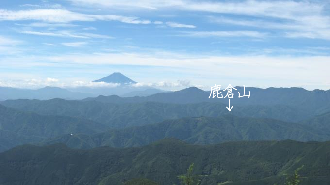 真正面には富士山が見えます。手前には奥多摩湖畔から登る鹿倉山の山頂と稜線全体を見渡すことができます。