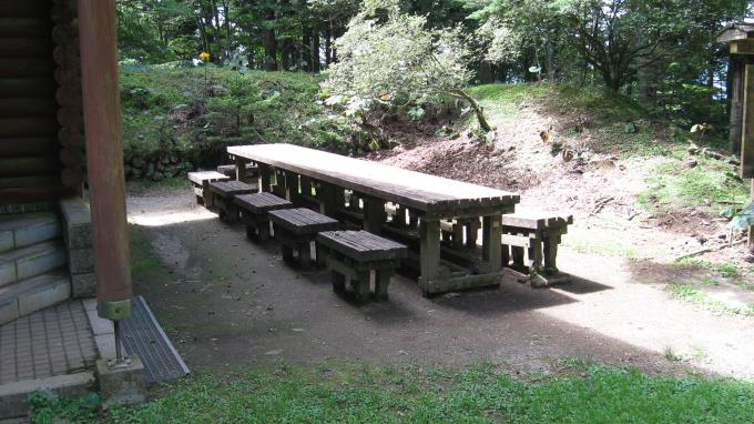 避難小屋の横には長いテーブルベンチがあり、ここでも座って休憩することができます。